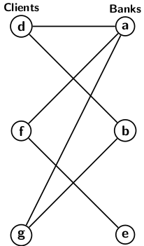 We may also use graphs to represent the relationship between different objects. For example, the graph below has two sets of vertices: one set representing banks and the other set as banks’ clients. The edges between vertices denote bank and customer relationships.