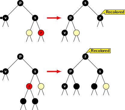 The readers can convince themselves that the recoloration followed by restructuring is correct for the second subcase. Two successive single rotations perform the restructuring of the tree: first a right rotation and then a left rotation around z. The first rotation bring z one level up and pushes s one level down. It may increase the black height of the right subtree of z after the first rotation. However, after second rotation z’s level is increases by 1 again and p is pushed one level down. Since z goes one level up, its right subtree also pushed one level up. So the original configuration of s and its two subtrees are restored. Recoloring z, it contributes 1 to the black heights of: