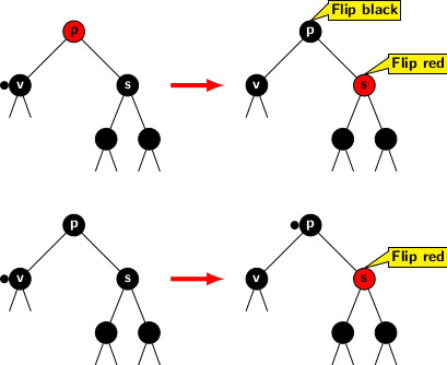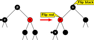If p is red then exchanging colors of p and s we get rid of excess black from v. It adjusts the black height of p’s right subtree to the original value by removing black color from s. But due to p acquiring black color, we could remove excess black from v.