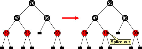 The little black rectangles in the figure represent external leaf nodes. The deletion of a node X may splice out a node at a position different from X unless X is a node with two external leaves. For example, to remove 70, we delete the node that had 55. However, it does not create any loss of information as the content of spliced node is copied in advance at the position where 70 was originally stored.